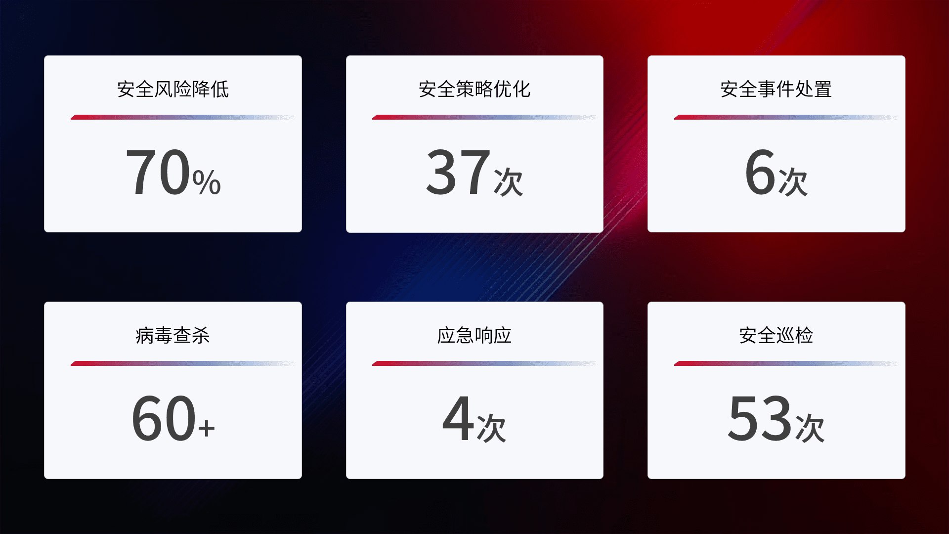 提供全面的安全事件报告体系,,包括处置报告、、、、周报、、、、季度和年度总结,,,结合持续监控,,帮助客户深入了解网络安全状况。。