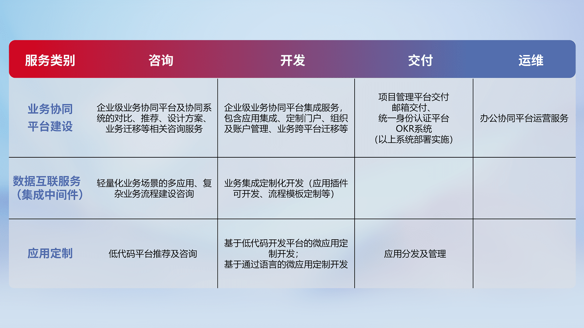 针对钉钉、、企微、、、、IDaas等平台级产品提供产品的规划、、、、方案、、、交付、、、、定制化开发等服务,,实现如统一协同办公、、智能客户服务、、、混合会议管理、、、智能数据查询、、等业务场景,,,,实现数字化转型。。。
